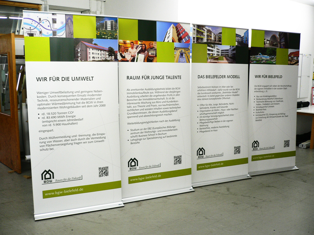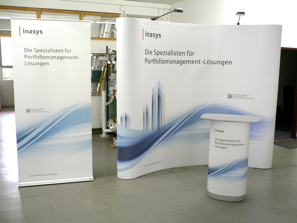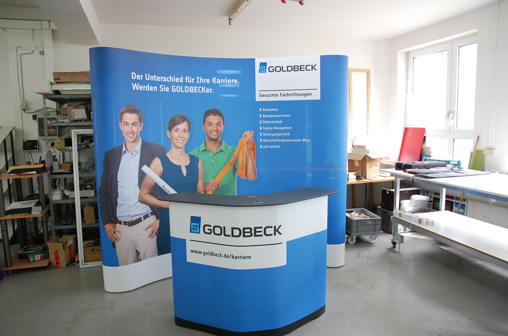 Sie möchten Ihr Unternehmen auf einer Messe hochwertig und aufmerksamkeitsstark präsentieren? Wir unterstützen Sie dabei mit unterschiedlichen Systemen gern. Ob Roll-ups, Banner, Counter, Vitrinen, selbststehende Messewände oder